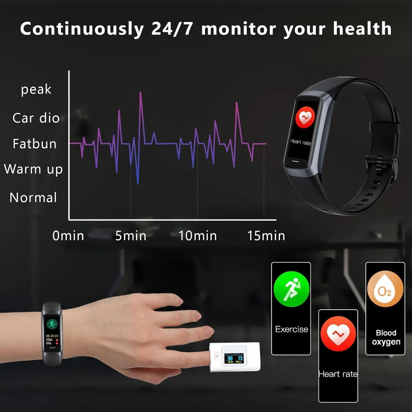 - 24/7 continuous monitoring of heart rate, blood oxygen, and body temperature