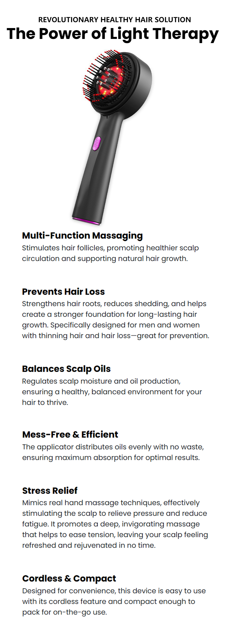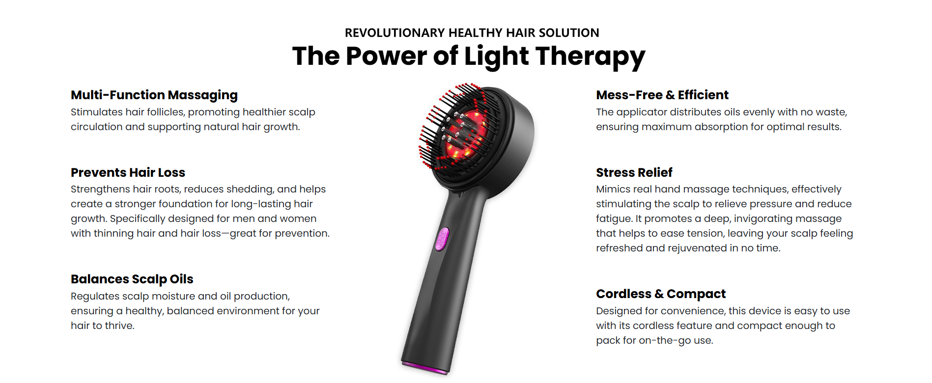 - 630nm Red Light Therapy – Revives hair from the roots, balances scalp oils, and reduces thinning.